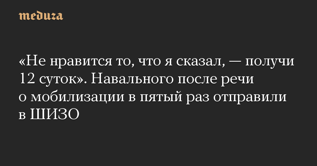 Не нравится то, что я сказал про мобилизацию — получи, Навальный 12 суток. Совершенно никто даже не скрывает политического контекста. Если мое право выступить против этой преступной мобилизации, из-за которой десятки тысяч людей погибнут ни за что… я посижу [за это] 12 суток и сколько еще нужно посидеть. И вы своим ШИЗО мне рот не заткнете. Это преступление против моей страны, я так ровно к нему и отношусь. Я молчать не буду и надеюсь, что все кто слышит меня, молчать не будут. Потому что то, что происходит сейчас, гораздо страшнее 12 суток… Путин кровью связывает сотни тысяч людей мобилизациями и «референдумами».