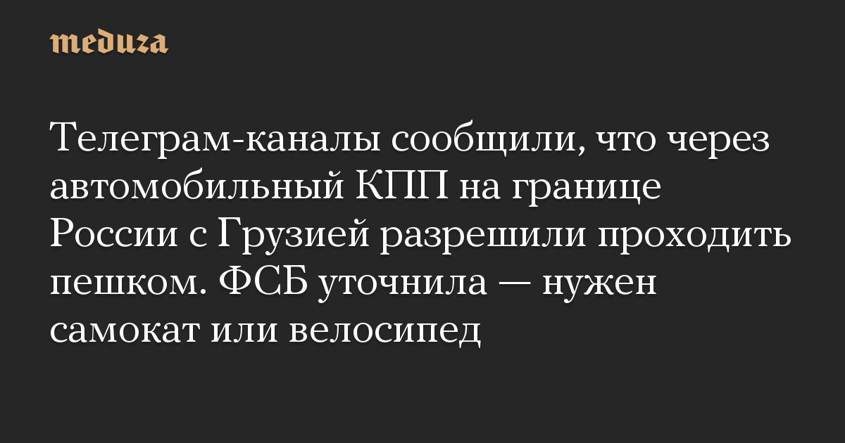 Телеграм-каналы сообщили, что через автомобильный КПП на границе России с Грузией разрешили проходить пешком. ФСБ уточнила — нужен самокат или велосипед
