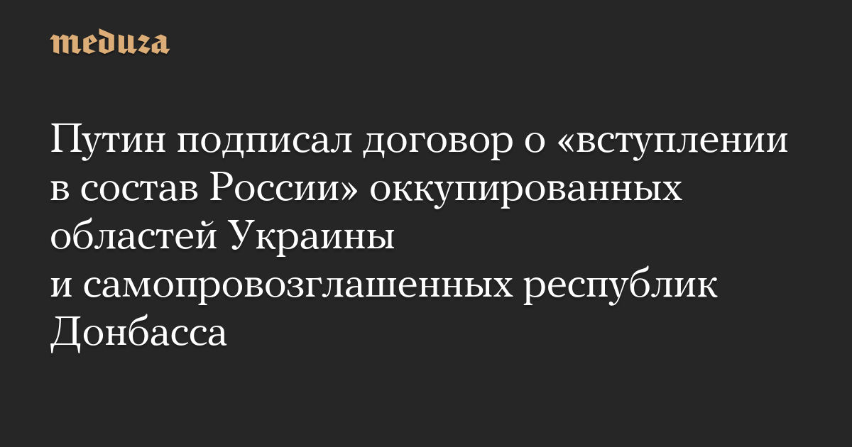 Президент РФ Владимир Путин и главы самопровозглашенных Луганской и Донецкой народных республик, а также оккупационных администраций Запорожской и Херсонской областей подписали в Кремле договоры о «вступлении в состав России». Подписи под документами также поставили Леонид Пасечник, Денис Пушилин, Евгений Балицкий и Владимир Сальдо соответственно.