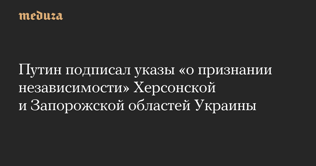 Президент России Владимир Путин подписал указы о «признании государственного суверенитета и независимости» Херсонской и Запорожской областей Украины.