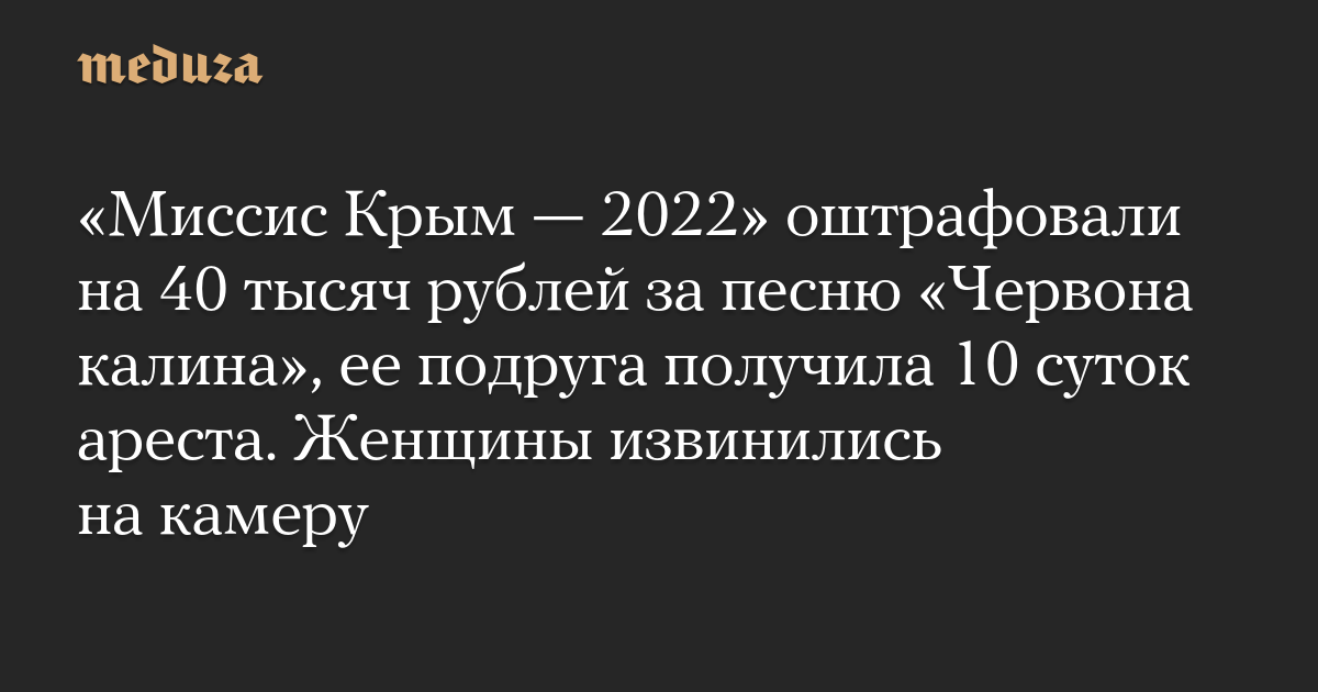 «Миссис Крым — 2022» оштрафовали на 40 тысяч рублей за песню «Червона калина», ее подруга получила 10 суток ареста. Женщины извинились на камеру