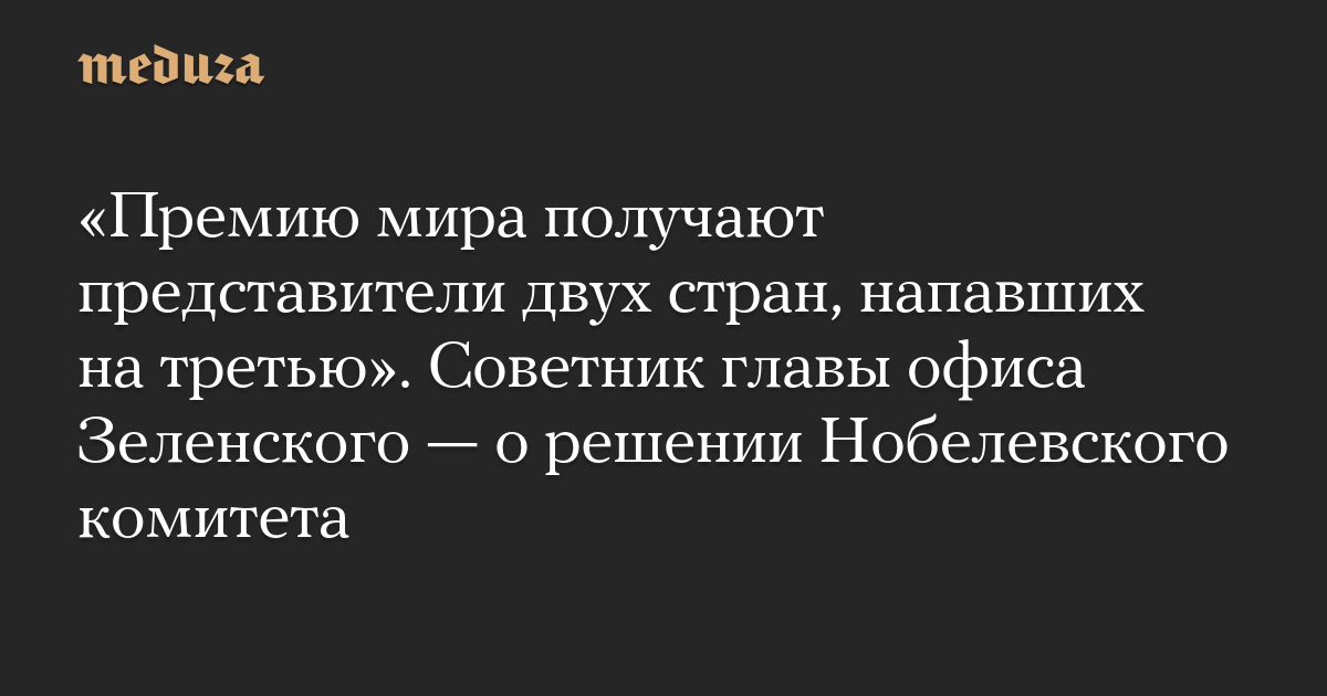 «Премию мира получают представители двух стран, напавших на третью». Советник главы офиса Зеленского — о решении Нобелевского комитета