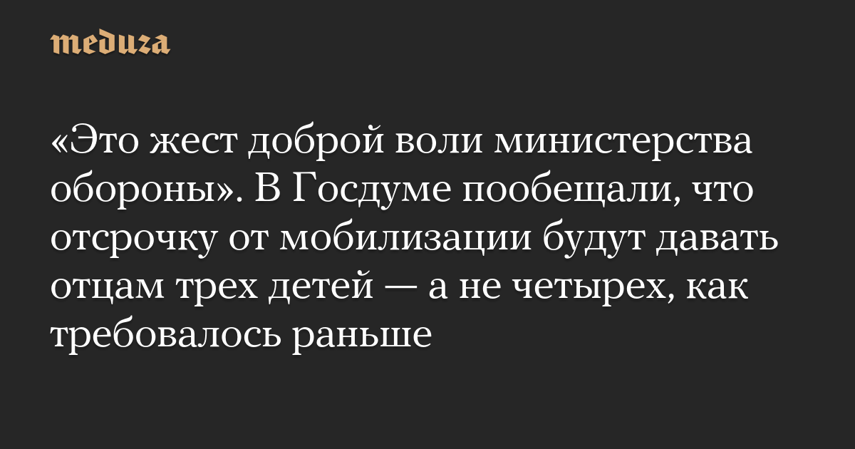 «Это жест доброй воли министерства обороны». В Госдуме пообещали, что отсрочку от мобилизации будут давать отцам трех детей — а не четырех, как требовалось раньше