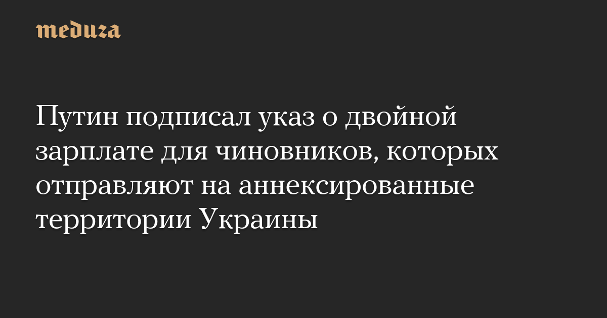 Президент России Владимир Путин подписал указ, согласно которому чиновники, командированные на аннексированные территории Украины, будут получать зарплату в двойном размере, а также суточные в размере восьми с половиной тысяч рублей.