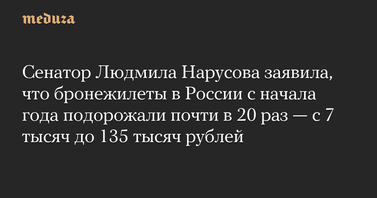 Сенатор Людмила Нарусова заявила, что бронежилеты в России с начала года подорожали почти в 20 раз — с 7 тысяч до 135 тысяч рублей