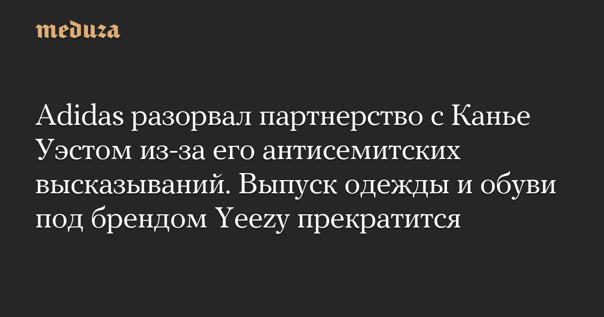 Немецкий производитель спортивных товаров Adidas объявил о разрыве партнерства с американским рэпером Канье Уэстом (его официальное имя — Йе), вместе с которым была создана линейка одежды и обуви Yeezy. Об этом сообщается на сайте Adidas.