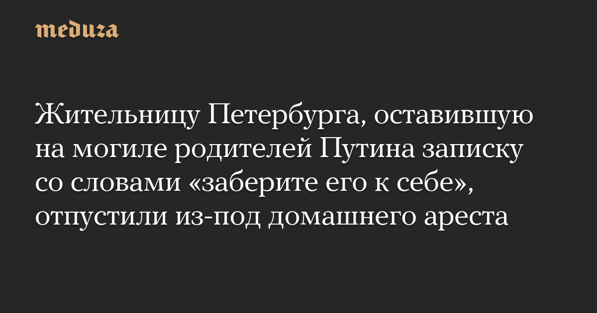 Жительницу Петербурга, оставившую на могиле родителей Путина записку со словами «заберите его к себе», отпустили из-под домашнего ареста