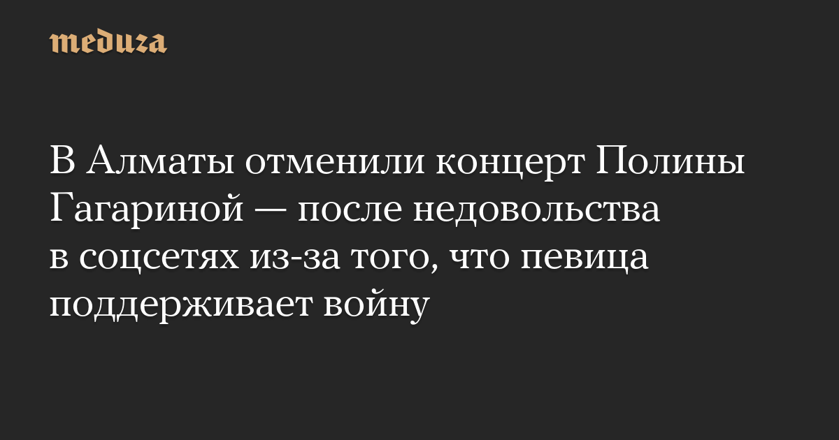 Концерт Полины Гагариной в Казахстане отменили, после того как в соцсетях активисты выразили возмущение тем, что в страну приедет певица, которая поддерживает войну. Об этом пишет казахское издание «Арбат.медиа».