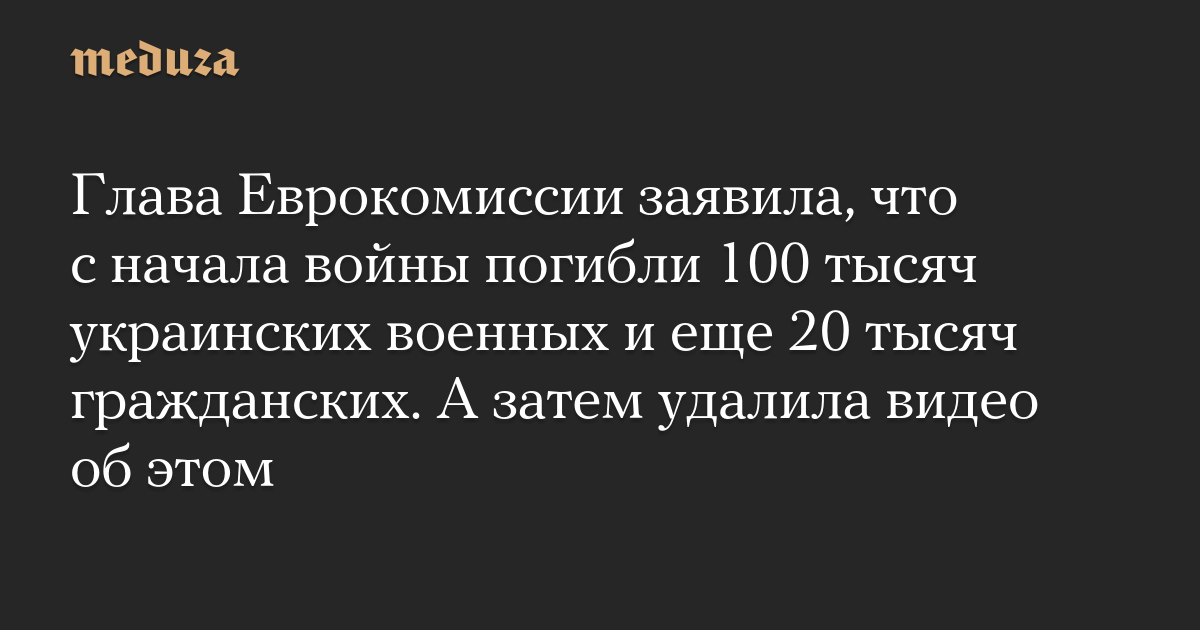 Глава Еврокомиссии заявила, что с начала войны погибли 100 тысяч украинских военных и еще 20 тысяч гражданских. А затем удалила видео об этом