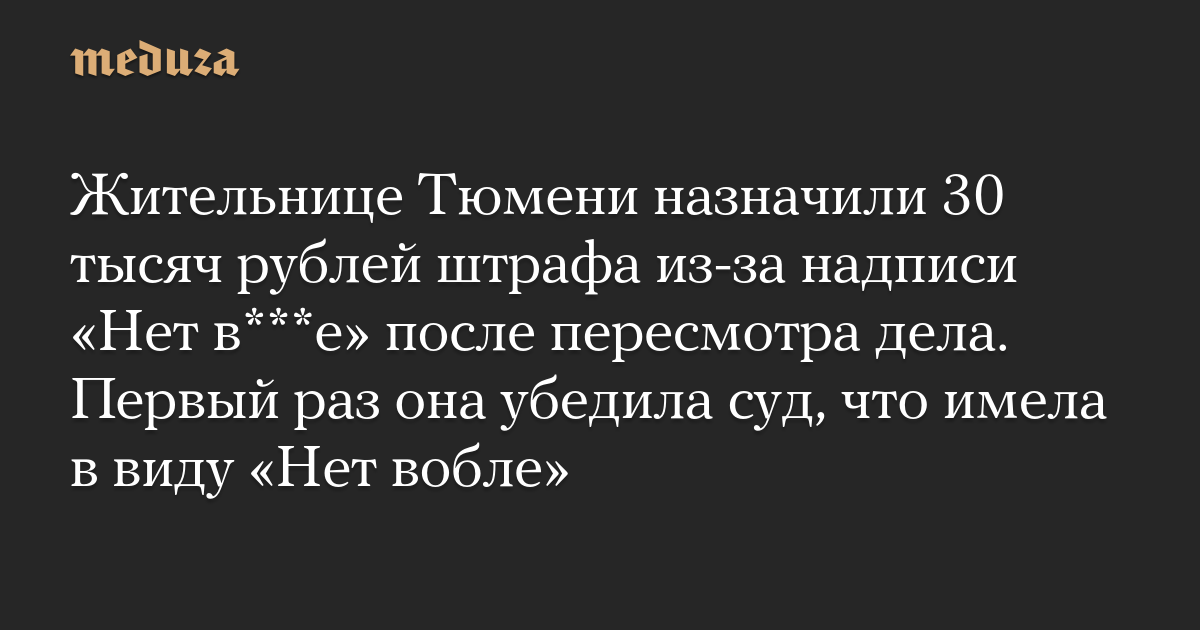 Жительнице Тюмени назначили 30 тысяч рублей штрафа из-за надписи «Нет в***е» после пересмотра дела. Первый раз она убедила суд, что имела в виду «Нет вобле»