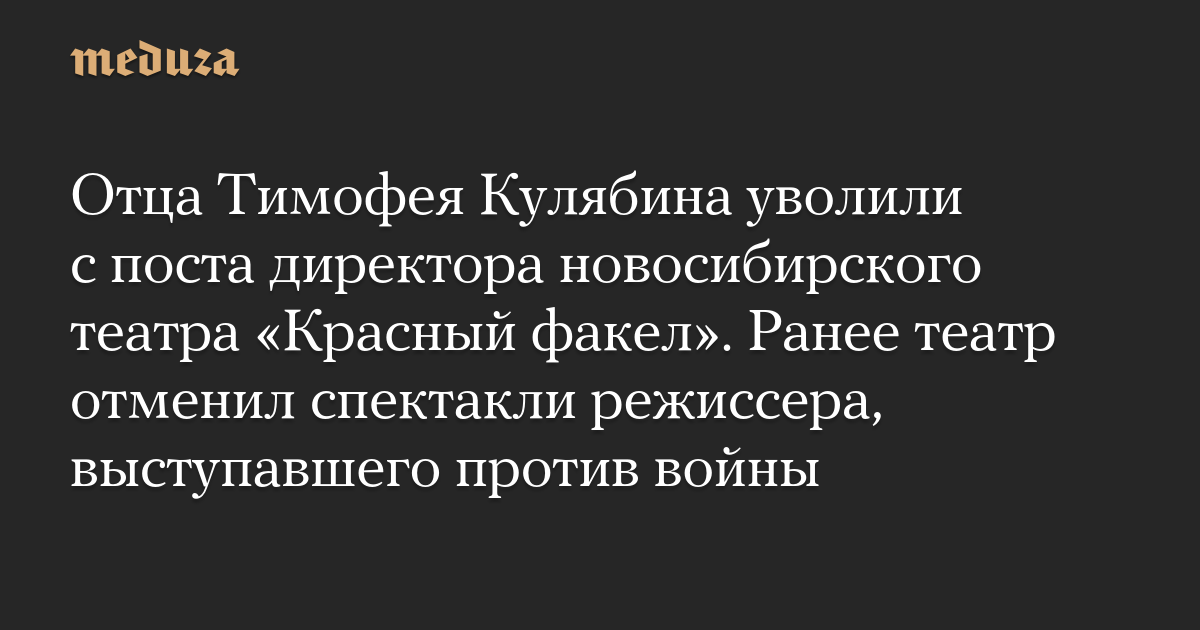 Новосибирский государственный театр «Красный факел» уволил с поста директора Александра Кулябина — отца режиссера Тимофея Кулябина, который выступал против войны в Украине и уехал из России после начала вторжения.