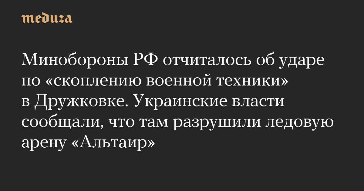 Минобороны РФ отчиталось об ударе по «скоплению военной техники» в Дружковке. Украинские власти сообщали, что там разрушили ледовую арену «Альтаир»