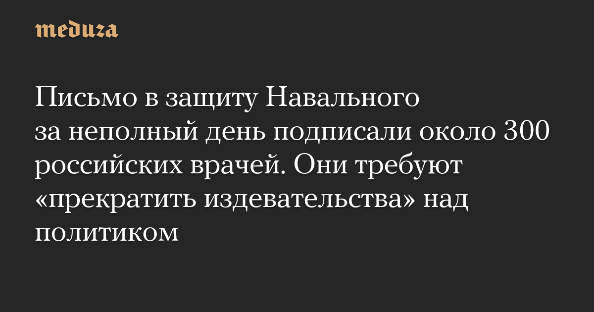 10 января за неполный день после публикации открытого письма к президенту России Владимиру Путину в поддержку оппозиционного политика Алексея Навального это письмо подписали около 300 российских врачей.