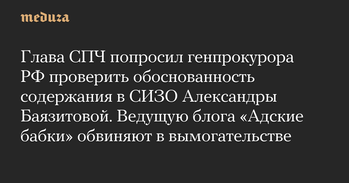 Глава СПЧ попросил генпрокурора РФ проверить обоснованность содержания в СИЗО Александры Баязитовой. Ведущую блога «Адские бабки» обвиняют в вымогательстве