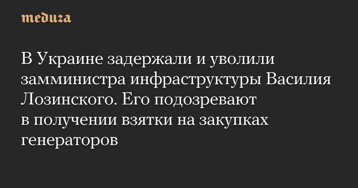 Сотрудники правоохранительных органов задержали заместителя министра развития общин, территорий и инфраструктуры Украины Василия Лозинского, подозреваемого в получении крупной взятки при закупке генераторов. Об обысках у чиновника 21 января сообщала «Украинская правда».