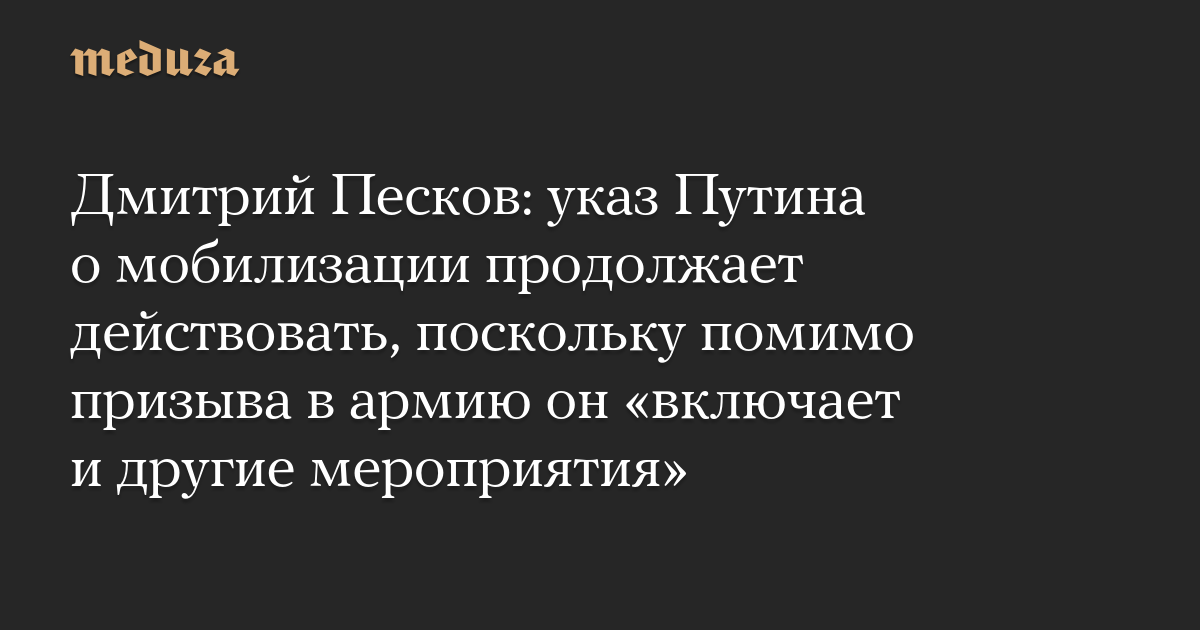 Дмитрий Песков: указ Путина о мобилизации продолжает действовать, поскольку помимо призыва в армию он «включает и другие мероприятия»
