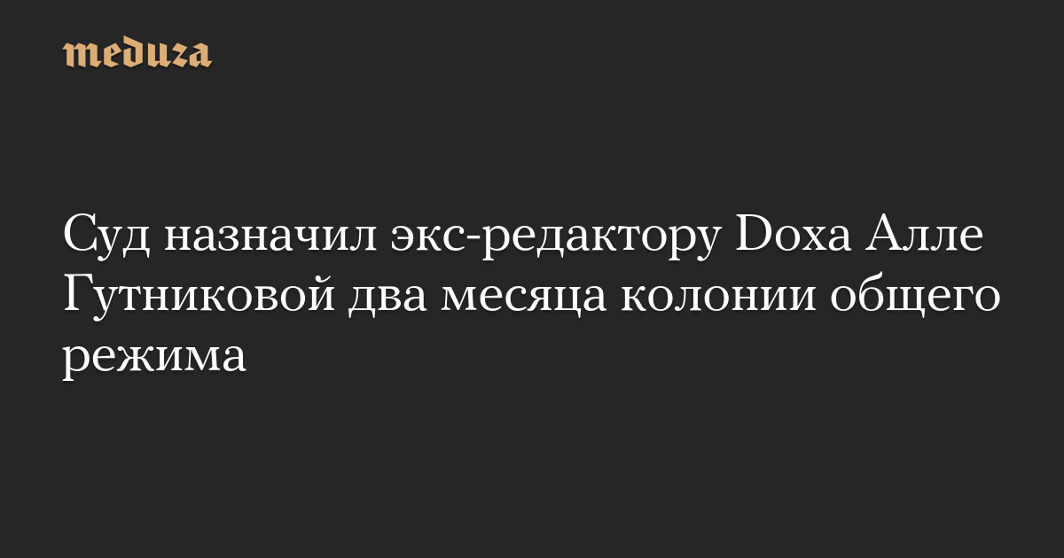 Дорогомиловский районный суд Москвы ужесточил наказание экс-редактору Doxa Алле Гутниковой, назначив ей два месяца колонии общего режима. Ранее журналистку приговорили к двум годам исправительных работ по делу о вовлечении подростков в протесты. Об ужесточении наказания Doxa сообщил адвокат Дмитрий Захватов.