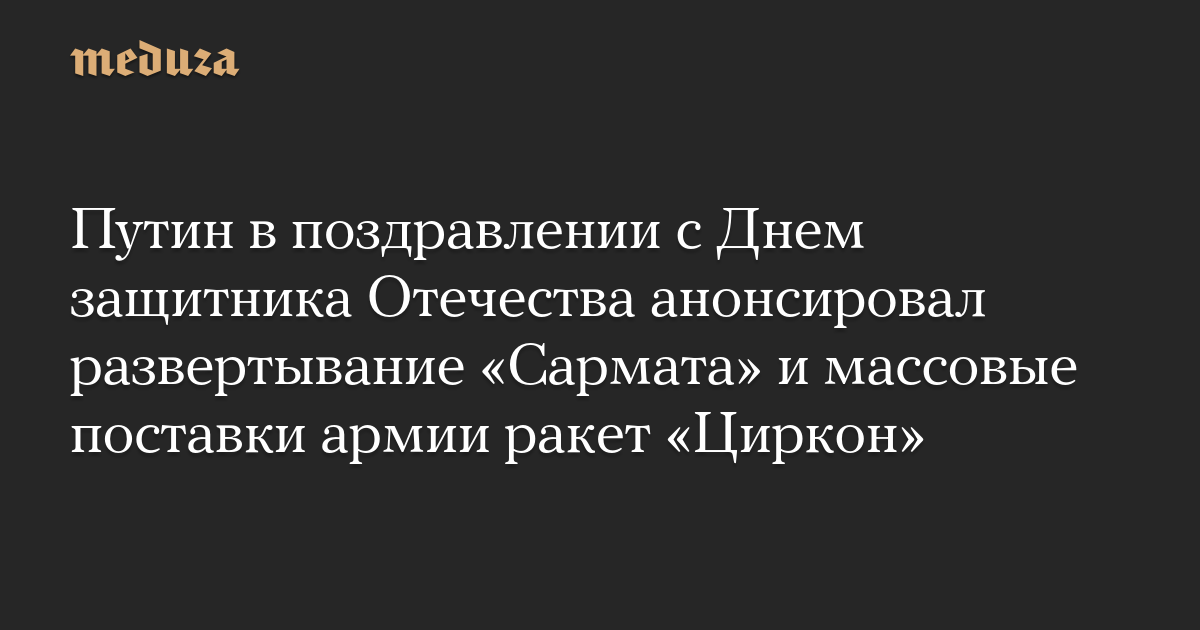 Путин в поздравлении с Днем защитника Отечества анонсировал развертывание «Сармата» и массовые поставки армии ракет «Циркон»