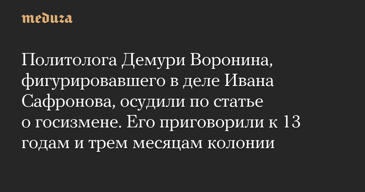 Политолога Демури Воронина, фигурировавшего в деле Ивана Сафронова, осудили по статье о госизмене. Его приговорили к 13 годам и трем месяцам колонии