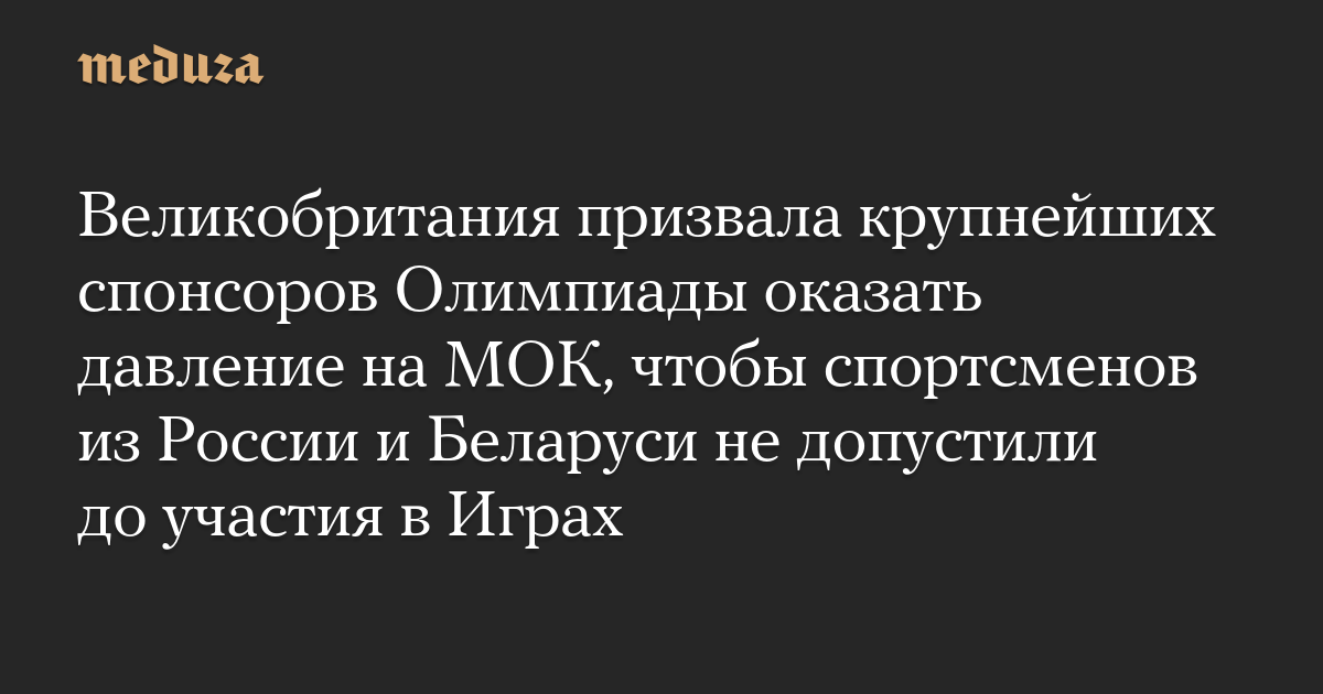 Британское правительство призвало крупнейших спонсоров Олимпиады убедить Международный Олимпийский комитет (МОК) в том, что спортсмены из России и Беларуси не должны быть допущены до участия в Играх в Париже, в том числе в нейтральном статусе.