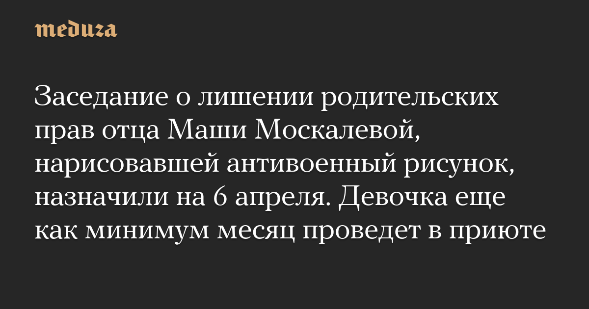 Заседание о лишении родительских прав отца Маши Москалевой, нарисовавшей антивоенный рисунок, назначили на 6 апреля. Девочка еще как минимум месяц проведет в приюте
