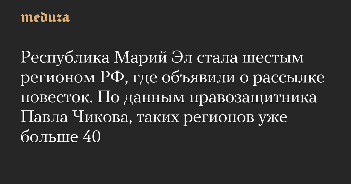 Республика Марий Эл стала шестым регионом РФ, где объявили о рассылке повесток. По данным правозащитника Павла Чикова, таких регионов уже больше 40