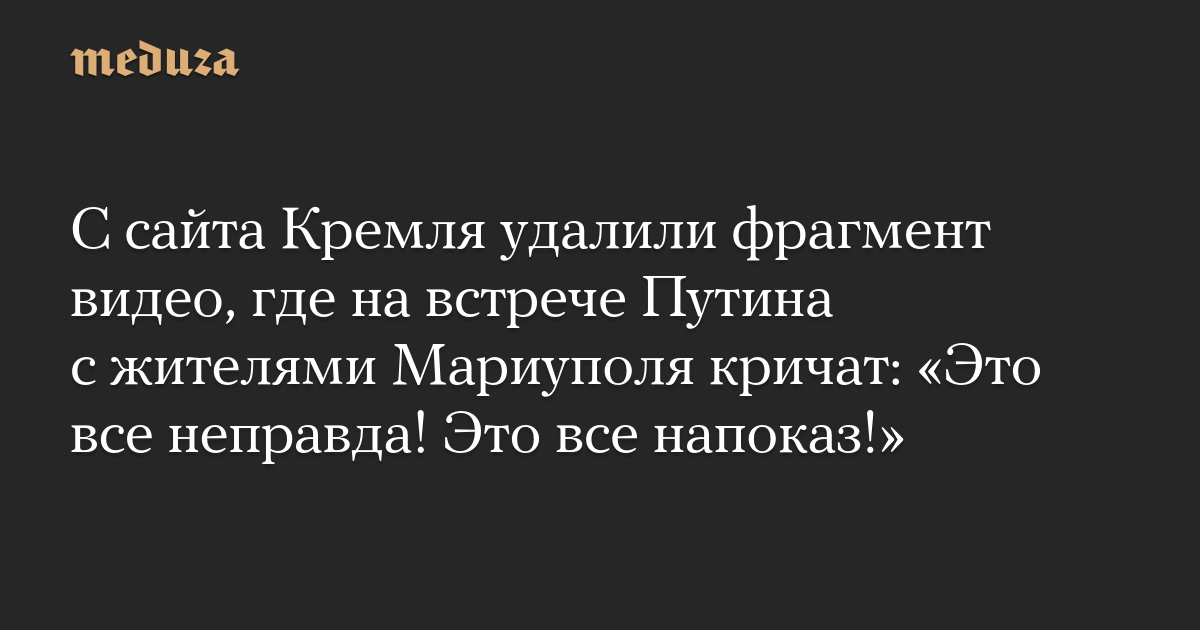 Пресс-служба Кремля перемонтировала видео со встречи Владимира Путина с жителями Мариуполя, на котором за кадром был слышен женский крик: «Это все неправда! Это все напоказ!».