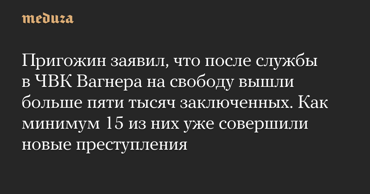 Пригожин заявил, что после службы в ЧВК Вагнера на свободу вышли больше пяти тысяч заключенных. Как минимум 15 из них уже совершили новые преступления