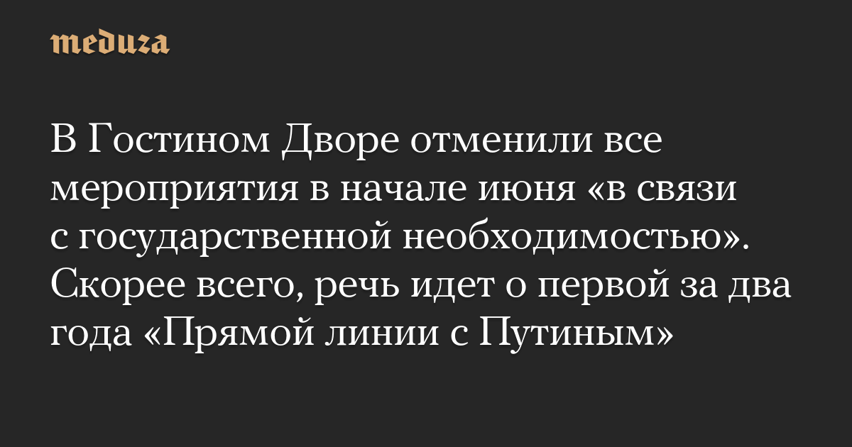 В Гостином Дворе отменили все мероприятия в начале июня «в связи с государственной необходимостью». Скорее всего, речь идет о первой за два года «Прямой линии с Путиным»