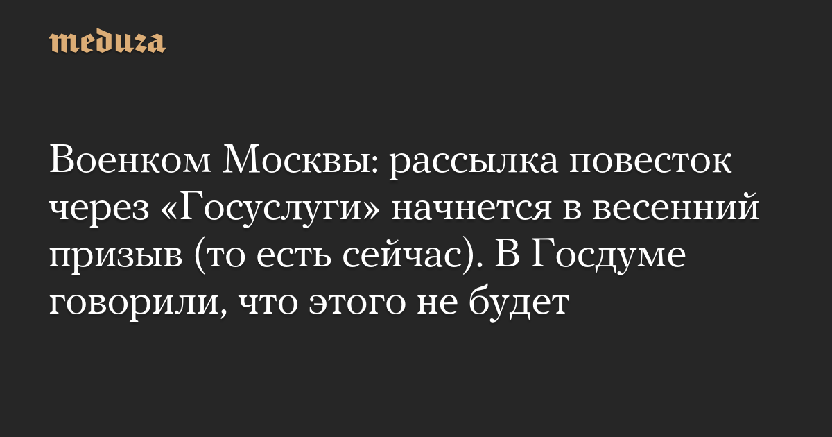 Военком Москвы: рассылка повесток через «Госуслуги» начнется в весенний призыв (то есть сейчас). В Госдуме говорили, что этого не будет