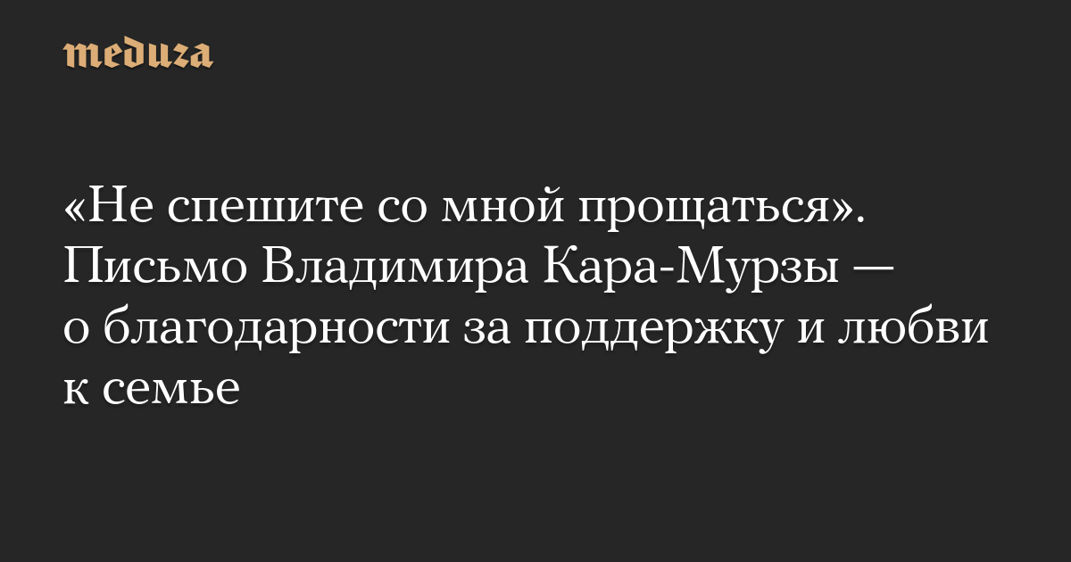 Также Кара-Мурза поблагодарил свою семью. Он отметил, что его бабушке было четыре года, когда ее отца расстреляли по статье о призывах к свержению советской власти, а ее муж по этой же статье сидел в лагере: «Недавно я поздравил ее с 90-летием письмом из тюрьмы. Жизнь человека как отражение эпохи». Самую большую благодарность политик адресовал своей жене Евгении, подчеркнув, что «не смог бы пройти весь этот путь» без ее поддержки. «Я люблю тебя. Все будет хорошо. Мы обязательно увидимся», — говорится в завершении письма.