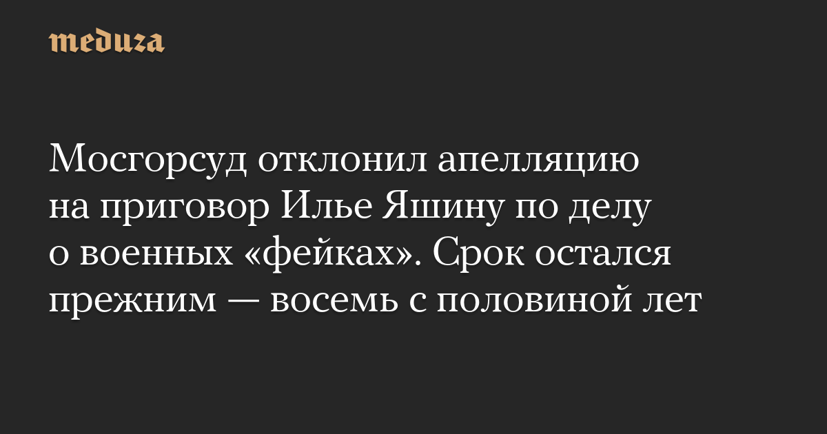 Московский городской суд отклонил апелляцию на приговор политику Илье Яшину по делу о распространении «фейков» про российскую армию, сообщает «Медиазона».