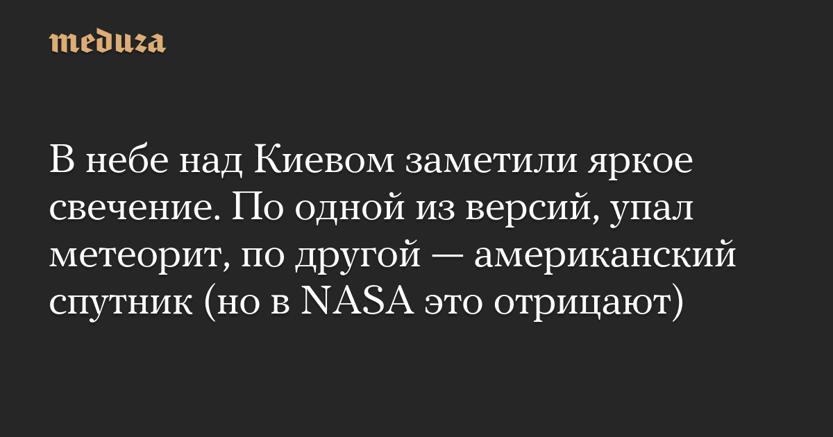 Вспышку в небе заметили около 22:00 по местному времени. В Киеве объявили воздушную тревогу, но «ПВО не сработала», заявил Попко. «По предварительной информации, это явление стало результатом падения на Землю космического спутника NASA», — добавил представитель киевских властей.