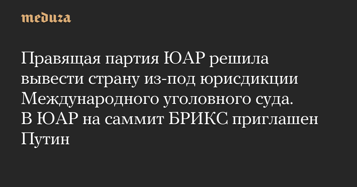 Правящая партия ЮАР решила вывести страну из-под юрисдикции Международного уголовного суда. В ЮАР на саммит БРИКС приглашен Путин