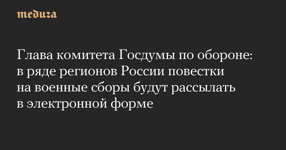 Глава комитета Госдумы России по обороне Андрей Картаполов заявил, что повестки на военные сборы для граждан, пребывающих в запасе, в ряде регионов будут рассылать в электронном формате, передает ТАСС.