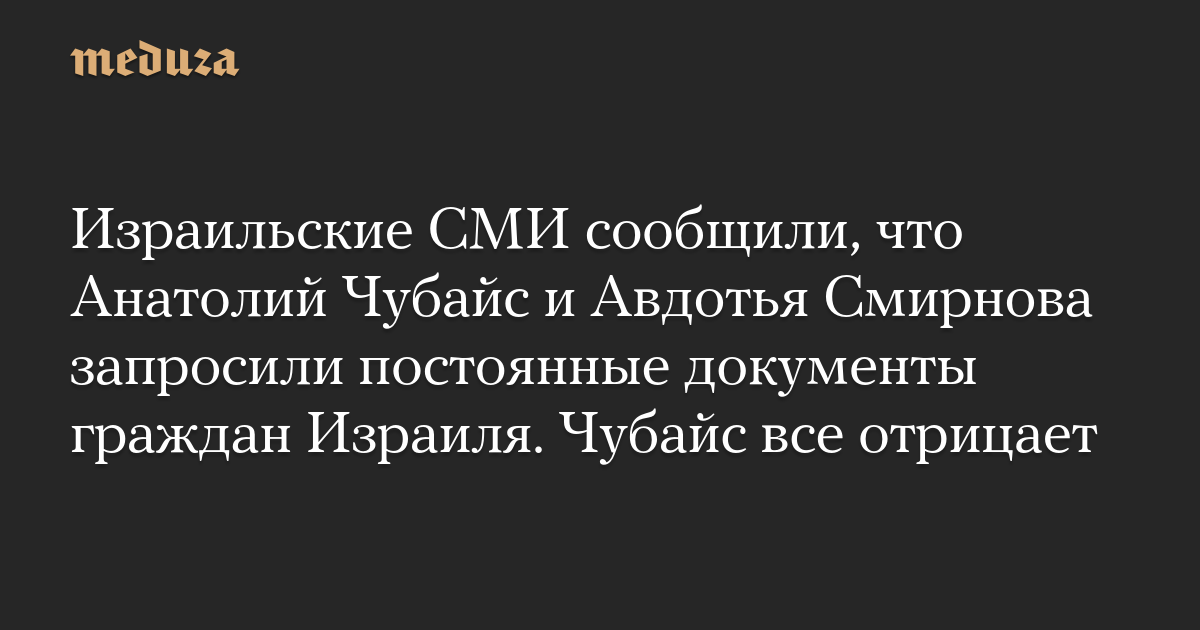 Израильские СМИ сообщили, что Анатолий Чубайс и Авдотья Смирнова запросили постоянные документы граждан Израиля. Чубайс все отрицает
