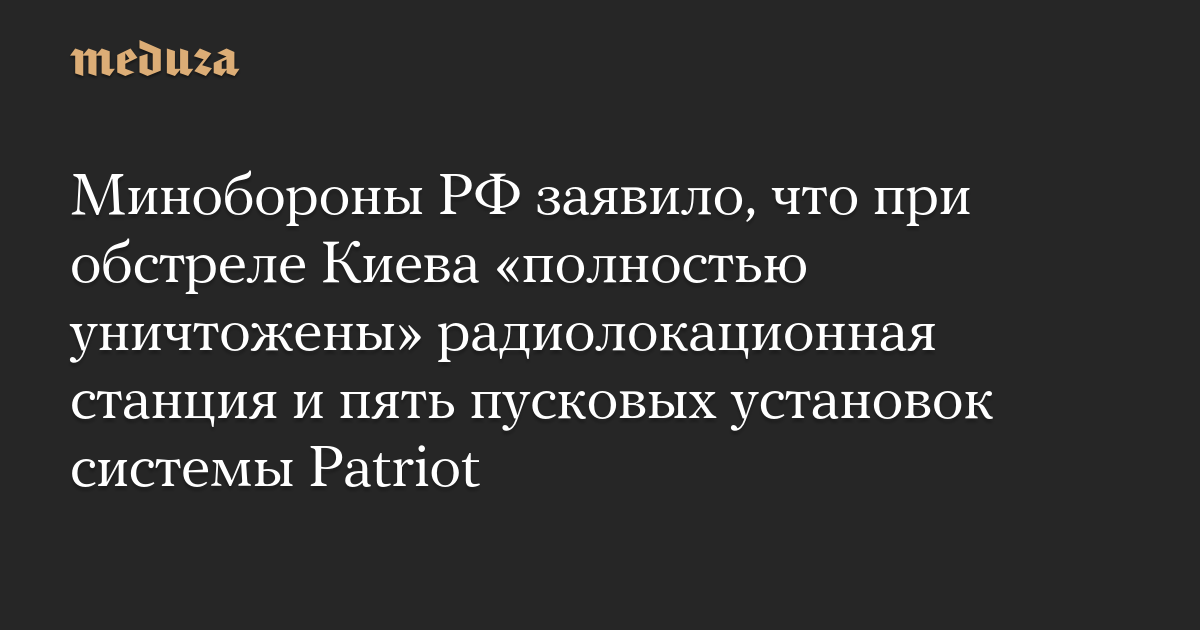 Минобороны РФ заявило, что при обстреле Киева «полностью уничтожены» радиолокационная станция и пять пусковых установок системы Patriot