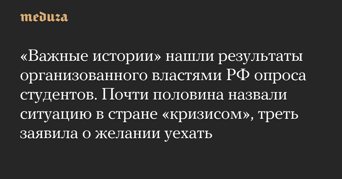 «Важные истории» нашли результаты организованного властями РФ опроса студентов. Почти половина назвали ситуацию в стране «кризисом», треть заявила о желании уехать