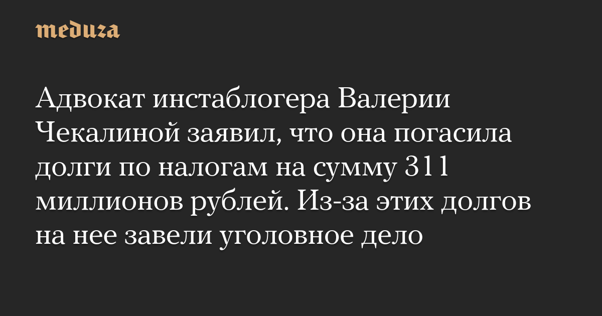 Адвокат блогера Валерии Чекалиной (ler_chek) и ее мужа Артема заявил, что его подзащитные полностью погасили задолженность по налогам.