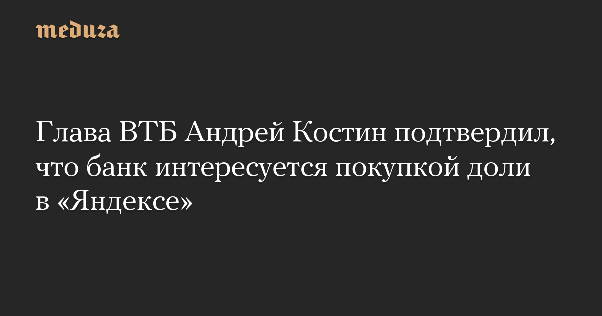 Глава ВТБ Андрей Костин подтвердил, что банк интересуется покупкой доли в «Яндексе»