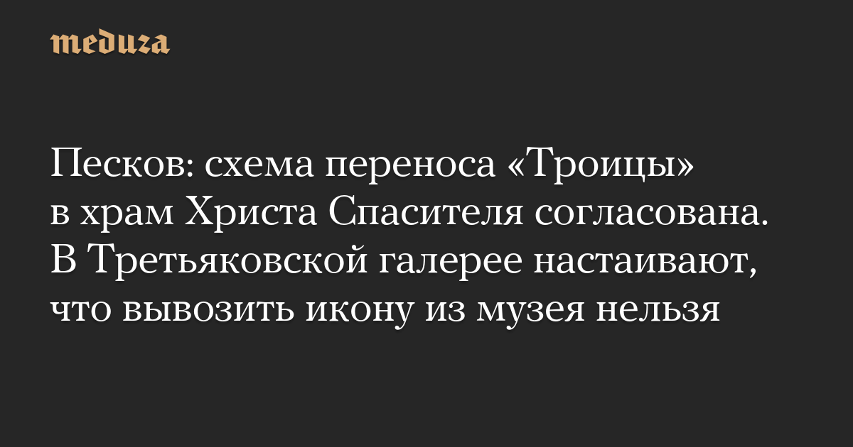 Пресс-секретарь президента России Дмитрий Песков сообщил, что схема переноса иконы Андрея Рублева «Троица» в храм Христа Спасителя к 4 июня уже согласована. Ранее экспертный совет Третьяковской галереи заключил, что в нынешнем состоянии икона не подлежит вывозу из музея и нуждается в реставрации.