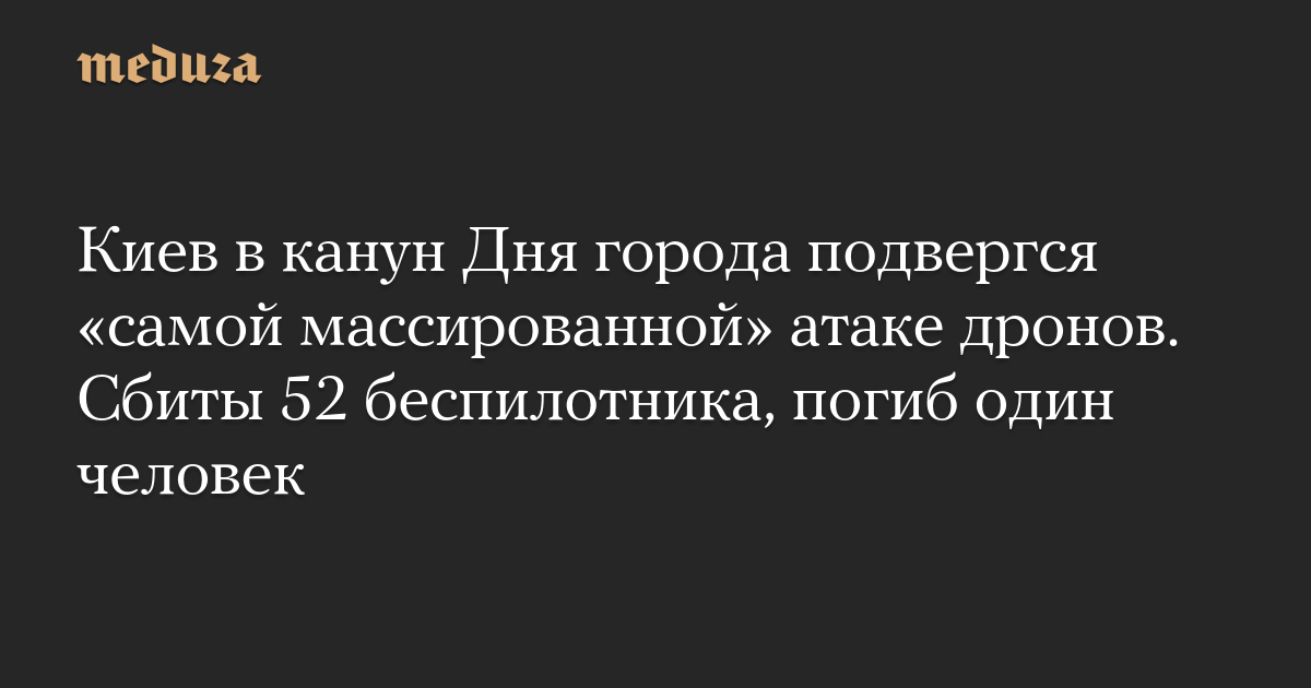 Киев в канун Дня города подвергся «самой массированной» атаке дронов. Сбиты 52 беспилотника, погиб один человек