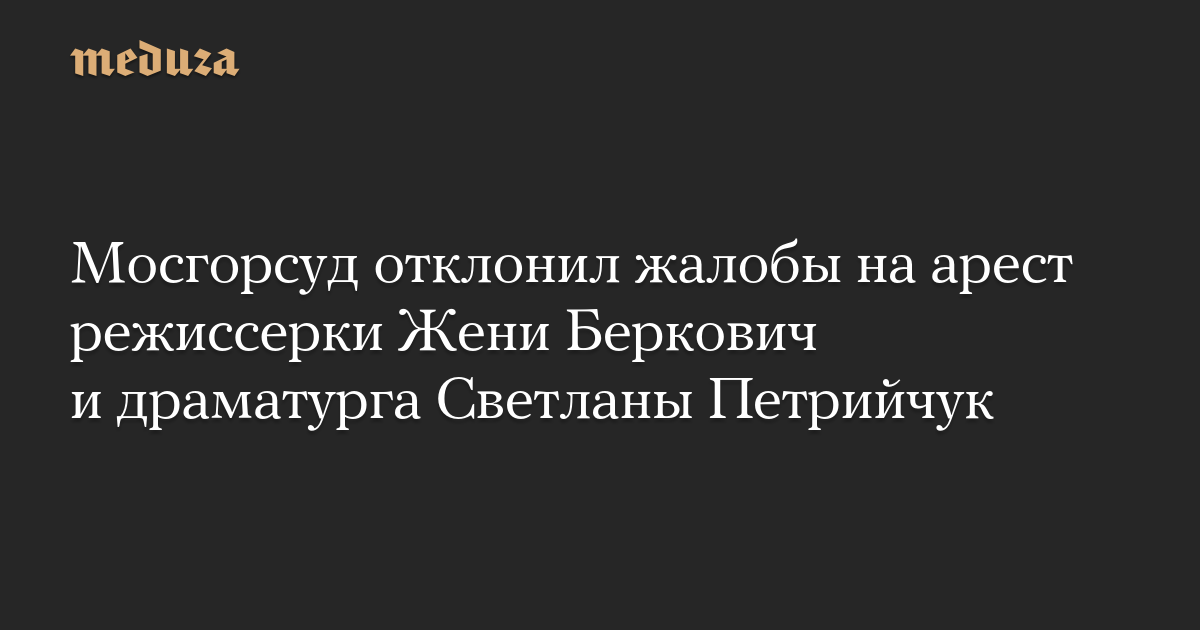 Мосгорсуд также отклонил жалобу на арест второй фигурантки дела, драматурга Светланы Петрийчук. 5 мая Замоскворецкий суд Москвы отправил их обеих в следственный изолятор. Ни Беркович, ни Петрийчук не признали себя виновными.