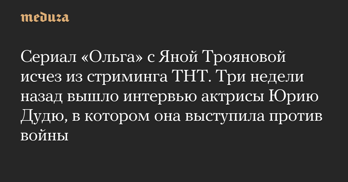 Сериал «Ольга» с Яной Трояновой исчез из стриминга ТНТ. Три недели назад вышло интервью актрисы Юрию Дудю, в котором она выступила против войны