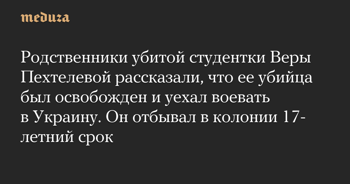 Родственники убитой студентки Веры Пехтелевой рассказали, что ее убийца был освобожден и уехал воевать в Украину. Он отбывал в колонии 17-летний срок