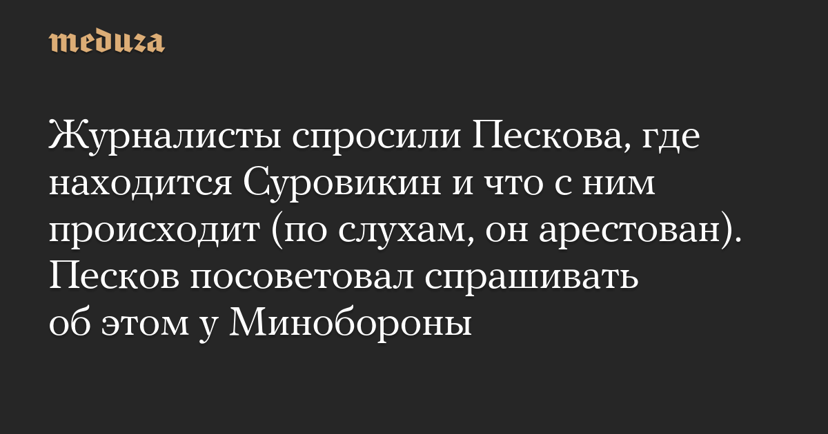 Журналисты спросили Пескова, где находится Суровикин и что с ним происходит (по слухам, он арестован). Песков посоветовал спрашивать об этом у Минобороны