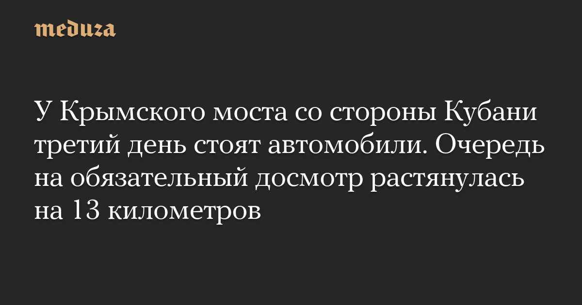Большая очередь на въезд на Крымский мост возникла 1 июля, к вечеру того дня она растянулась на семь километров, а время ожидания досмотра составляло пять часов, говорили в министерстве транспорта аннексированного Крыма. Днем 2 июля пробка начала увеличиваться и с тех пор, согласно официальным сообщениям, ее длина не была меньше шести километров.