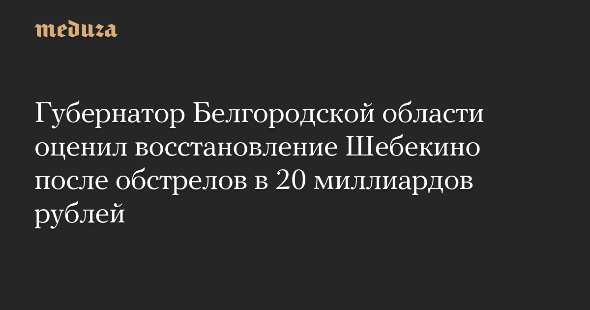 Губернатор Белгородской области Вячеслав Гладков заявил, что на восстановление жилья, предприятий и социальных объектов в городе Шебекино после обстрелов нужно не менее 20 миллиардов рублей, сообщает ТАСС.