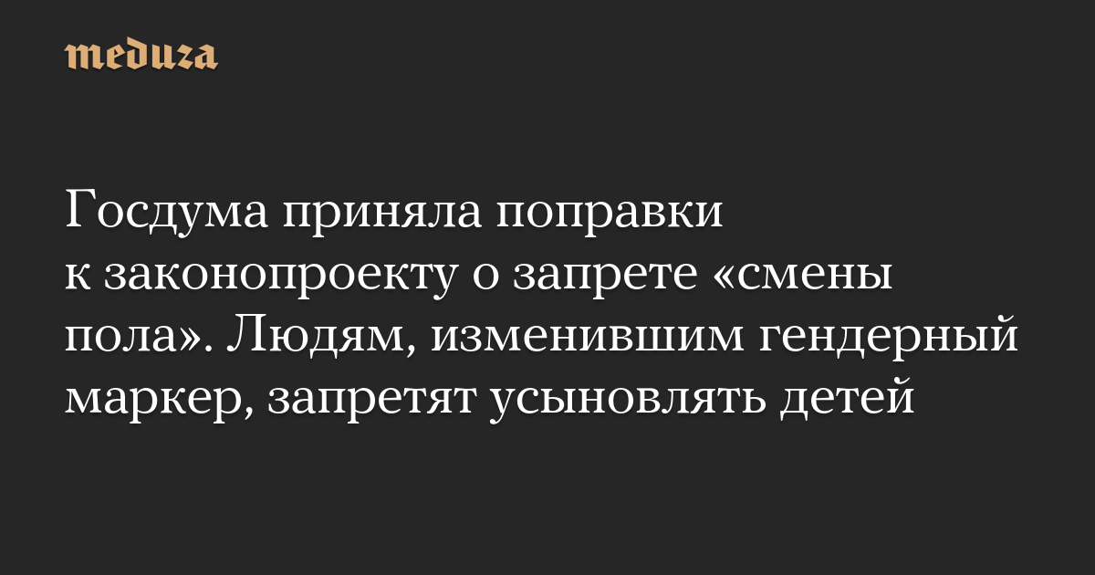Госдума приняла поправки к законопроекту о запрете «смены пола». Людям, изменившим гендерный маркер, запретят усыновлять детей