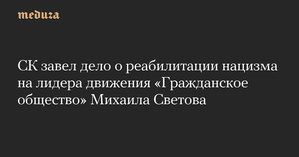 Следственный комитет РФ возбудил уголовное дело по статье о реабилитации нацизма в отношении лидера движения «Гражданское общество» Михаила Светова, сообщают источники РИА Новости и ТАСС.